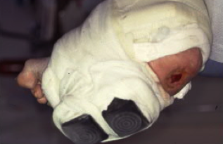 Photo 5 : Botte plâtrée de décharge d'une plaie de l'arriere pied.