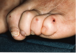 L’amyotrophie et l’ataxie proprioceptive vont entrainer des déformations articulaires et des zones hyperpression (photo 1a), qui vont ensuite s’auto-aggraver. L’atteinte des fibres végétatives va entrainer le développement de kératomes sur ces zones d’hyperpression (photo 1b). Ces kératomes creusent des plaies dans un pied rendu insensible par la neuropathie sensitive, et ces plaies sont souvent masquées par le kératome (photo 2). A l’occasion d’une fissure de ce dernier, les germes s’engouffrent dans les plans profonds du pied, et le patient arrive aux urgences ou chez son médecin traitant avec une dermo-hypodermite (photo 3). Il n’a rien senti venir, et pour cause, il a une neuropathie sensitive. Sa glycémie et son hygiène de vie n’y sont pour rien, l’avenir de sa jambe dépend maintenant de la qualité du professionnel de santé qu’il va croiser.